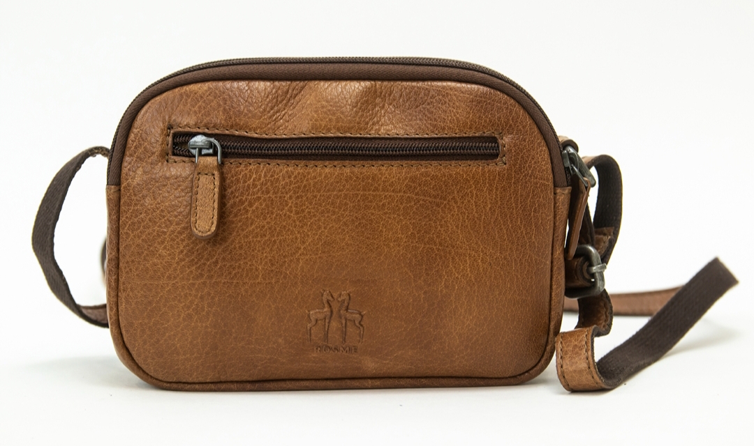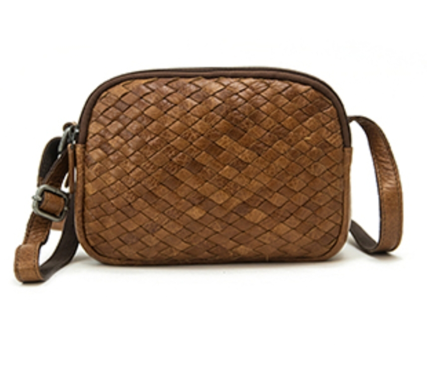 Bolso de piel para mujer pequeño de gran capacidad. Diseño atemporal. Trenzado a mano. Dispone de correa para llevarlo como bandolera. Color cuero.