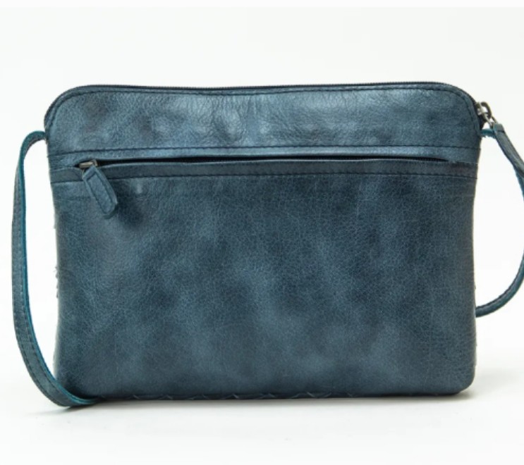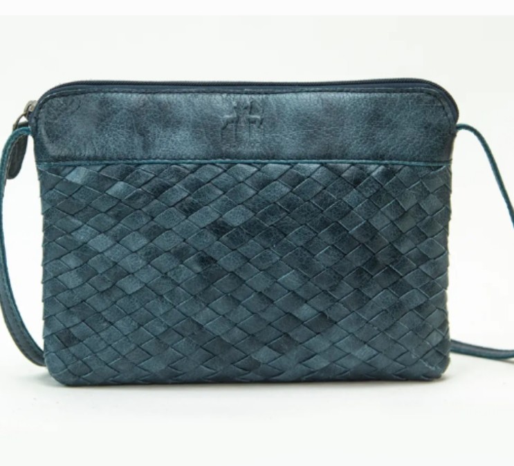 Bolso de piel para mujer pequeño. Diseño atemporal. Trenzado a mano. Dispone de correa para llevarlo como bandolera. Color azul.